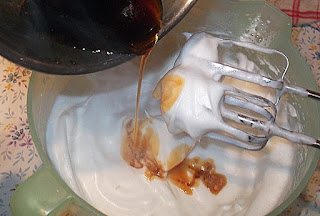 siropul fierbinte se toarna suvita in spuma de albus batand incontinuu