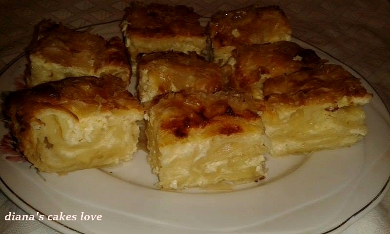 Restul foilor unse, le rupem in bucati si le amestecam in compozitia cu branza. Turnam compozitia in tava si acoperim cu celelalte trei foi unse.